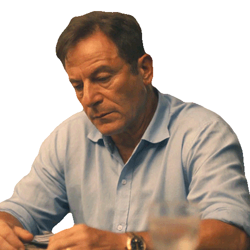 Timothy Ratliff from The White Lotus looks annoyed and displeased, sitting at a table in a blue shirt.