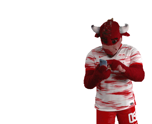 RB Leipzig mascot Bulli answers a phone call, holding a mobile phone to his ear. He looks surprised.