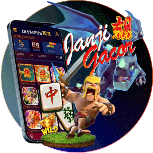 An animated sticker promoting Olympus188 slots, featuring a Clash of Clans Barbarian and "Janji Gacor" text.