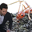 Ant-Man and another man react with surprise to a large, menacing ant in a humorous moment.