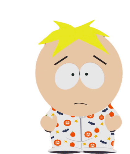Butters Stotch looks anxious and worried, fidgeting in his Halloween-themed pajamas with pumpkins and bats.