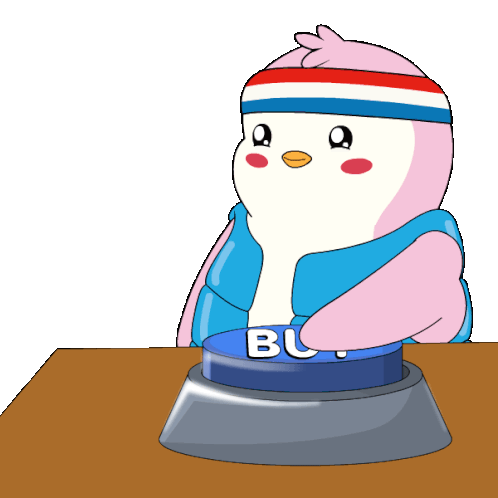 A pudgy penguin presses a blue buy button, symbolizing crypto investment and hodling in a fun, animated way.