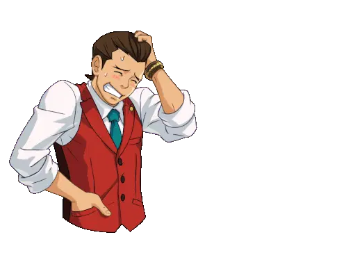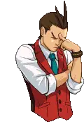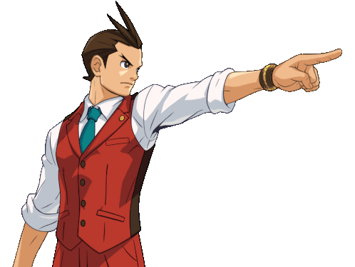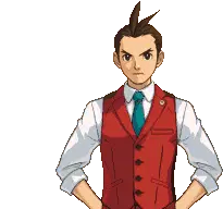 Apollo Justice from Ace Attorney points forward with a determined expression, ready to present evidence.