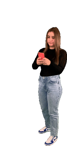 A woman in a black sweater and blue jeans intently looks at her cell phone, possibly using an Appen Swapphone service.