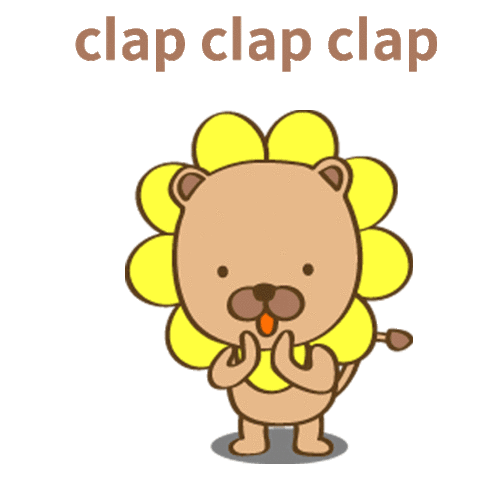 A cute cartoon lion with a flower-like mane claps its hands, accompanied by 'clap clap clap' text.