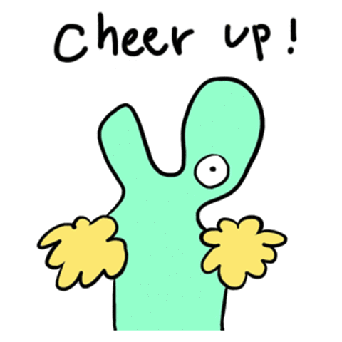 A cute green cartoon creature with yellow hands encourages with the text 'Cheer up!', perfect for appreciation.