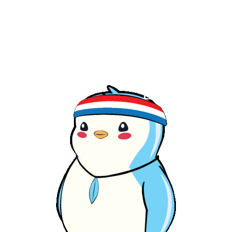 A cute Pudgy Penguin character with a headband flexes its arms, revealing 'THANK YOU' for appreciation and gratitude.
