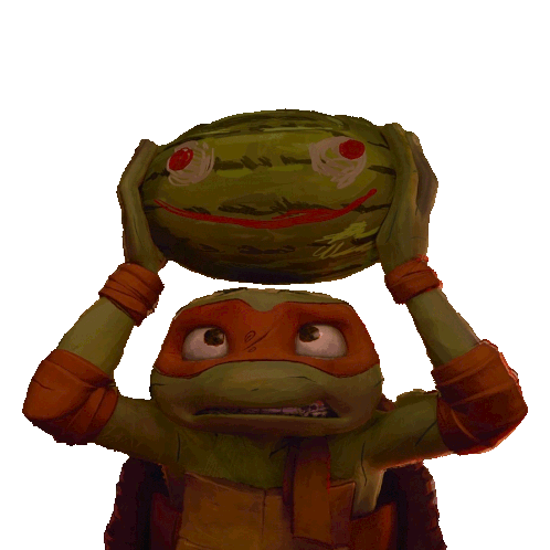 Michelangelo from TMNT Mutant Mayhem looks apprehensive while holding a watermelon with a worried face above his head.