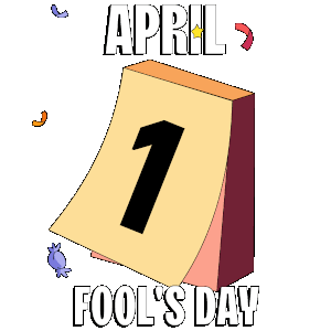 A cute penguin in a jester hat peeks from behind a calendar showing 'April 1 Fool's Day' with confetti. A playful prank.