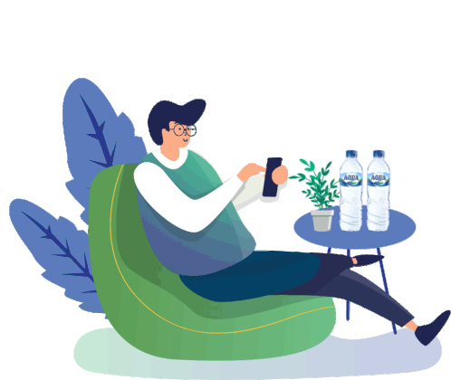 Animated person on a bean bag chair, happily checking phone with Aqua water bottles nearby, feeling 'Asik Diperhatiin'.