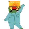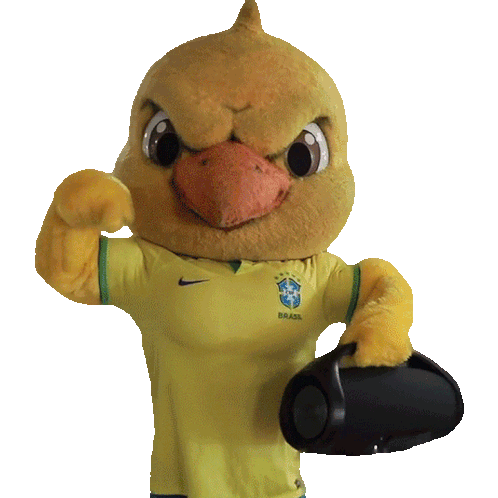 Canarinho Pistola, the Brazil football mascot, shows a thumbs down and holds a speaker, then wears a mask.