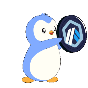 a blue and white penguin is holding a coin with the letter n on it