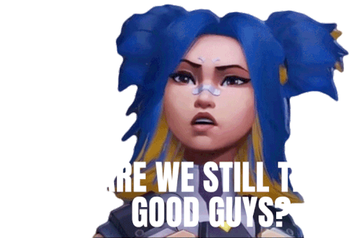A blue-haired Valorant character asks, 'Are we still the good guys?' with a concerned expression.