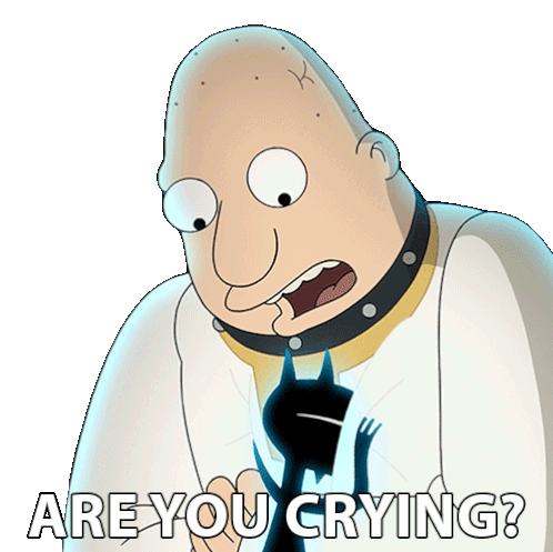 Jerry from Disenchantment asks "ARE YOU CRYING?" while looking down at a small black cat.