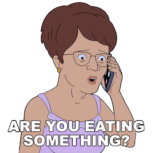 a cartoon of a woman talking on a cell phone and the words are you eating something