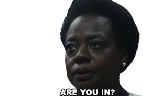 Amanda Waller, portrayed by Viola Davis, asks 'ARE YOU IN?' with a serious, direct expression.
