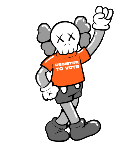 Aribennett's KAWS-style character encourages voter registration, wearing an orange 'REGISTER TO VOTE' shirt and raising a fist.