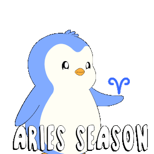A cute blue and white penguin celebrates Aries season, with the Aries zodiac symbol and text 'ARIES SEASON'.