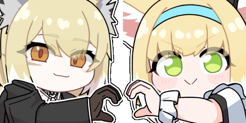 Arknights characters Suzuran and Vulpisfoglia form a heart with their hands, expressing love and affection.