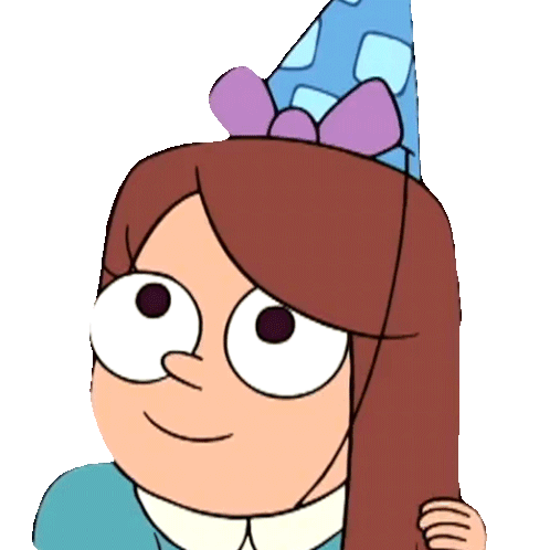 Kimby from Clarence gently strokes and adjusts her long brown hair, wearing a blue party hat.