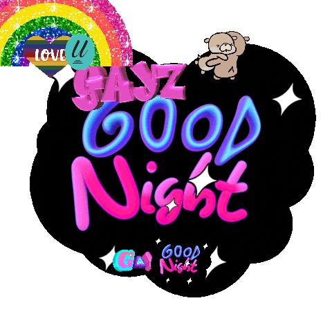 A vibrant sticker featuring the text 'GAYZ GOOD Night' with a glittery rainbow, a heart, and a cute teddy bear.