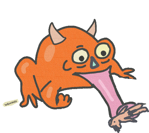 Luis Ricardo's cartoon horror creature, an orange horned frog-like monster, devouring a smaller animal.