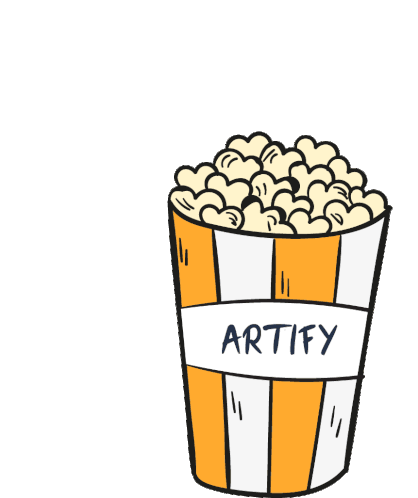 A cartoon bucket of popcorn with "ARTIFY" on it, animated with popping kernels.
