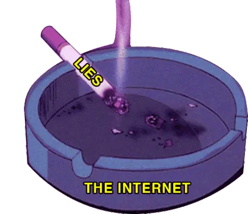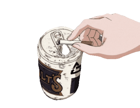 An animated hand places a lit cigarette into a dirty soda can, repurposing it as an ashtray in a retro anime style.