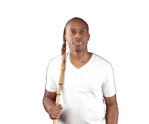 Bernardson, a man in a white shirt, smiles and laughs while holding a traditional rara baton over his shoulder.