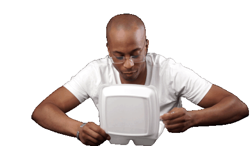 Askb Bernardson intensely eats from a white takeout container, focused on his meal.