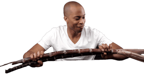 Askb Bernardson holds a long stalk of sugarcane, looking intently at it, preparing to cut or process it.