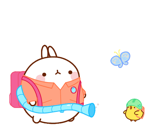 A cute rabbit character attempts to vacuum a butterfly but accidentally sucks up a small chick, leading to a comical mishap.