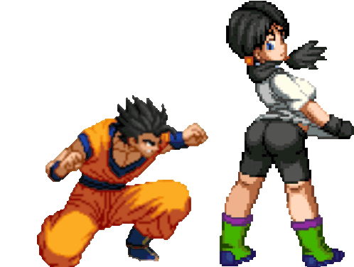 Gohan and Videl from Dragon Ball engage in a pixel art fight, featuring an ass punch and ass slap action.