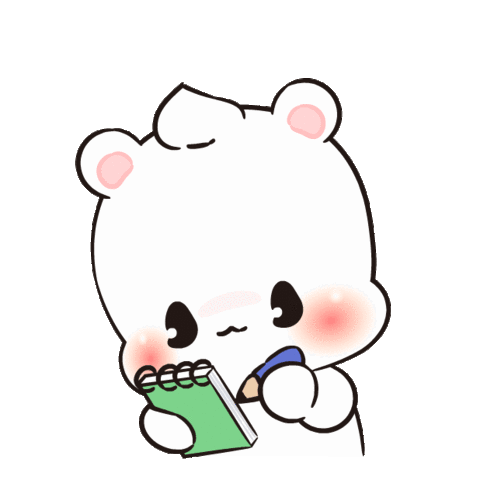 A cute white bear character diligently writing in a green notebook, appearing focused on assignments or studying.