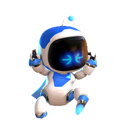 Astro Bot performs a cute dance, moving its arms and displaying blue arrows on its screen face.