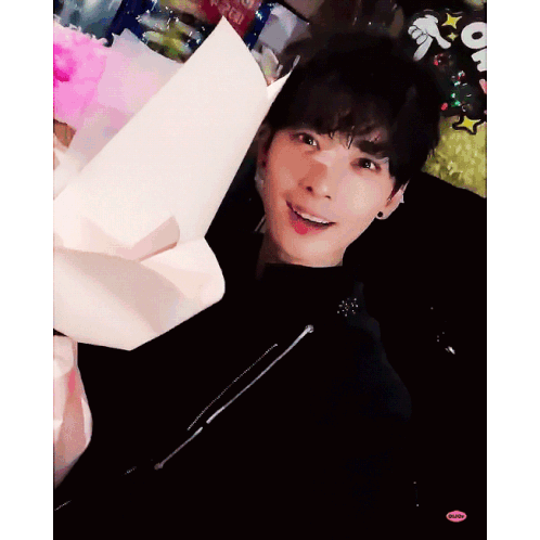 Astro Eunu smiles brightly while holding a bouquet of flowers, radiating happiness and charm in this animated sticker.