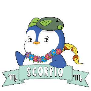 Adorable penguin wearing a fish hat and flower lei, proudly displaying the Scorpio zodiac sign.