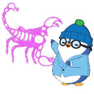 A cute Pudgy Penguin points to a glowing pink Scorpio zodiac sign, perfect for astrology fans.