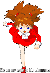 Asuka Chungus, in a 'Big Chungus' style, runs energetically, embodying the 'On My Way' meme.