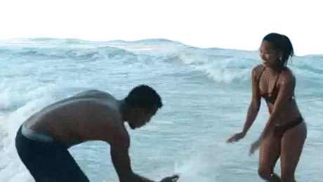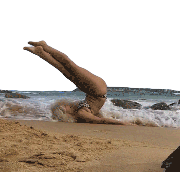 A woman in a bikini lies on a sandy beach with her legs in the air, getting unexpectedly splashed by a crashing wave.