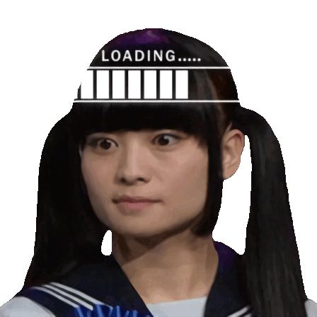 Mizyu from Atarashii Gakko with pigtails and a loading bar on her head, looking confused and thinking.
