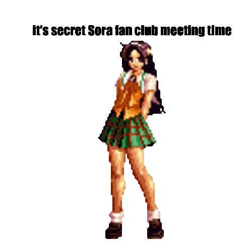 Athena Asamiya and her friends gather for a secret Sora fan club meeting, striking poses in their school uniforms.