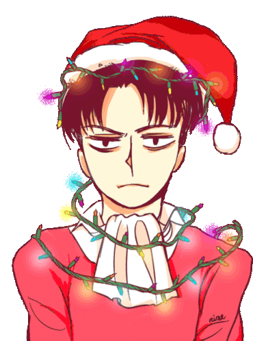 Levi from Attack On Titan looks unimpressed while adorned with festive Christmas lights and a Santa hat, capturing a 'sad Christmas' mood.