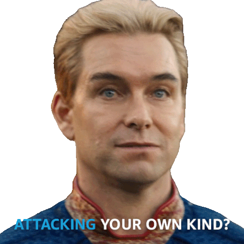 Homelander, played by Antony Starr, questions "Attacking your own kind?" in a moment of surprise.