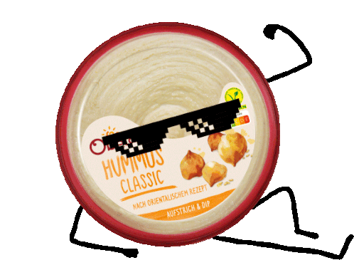 A tub of Obela Hummus Classic wearing pixelated 'Deal With It' sunglasses, chilling with stick figure limbs.
