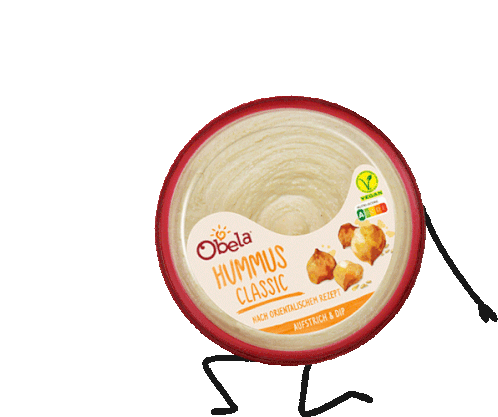 An animated sticker of an Obela Hummus Classic tub with stick figure arms and legs, holding a black rose in a bowing pose.
