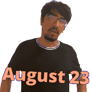 a man wearing glasses and a black shirt with the date august 23
