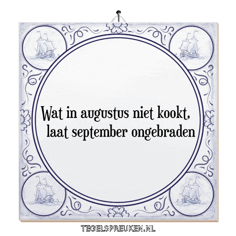 a blue and white tile with the words wat in augustus niet kookt laat september ongebraden