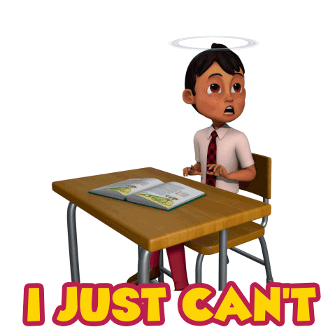 Cartoon boy slumped at a desk with 'I Just Can't' text, expressing exhaustion or frustration, featuring Aur Nahi Bhoot Bandhus.