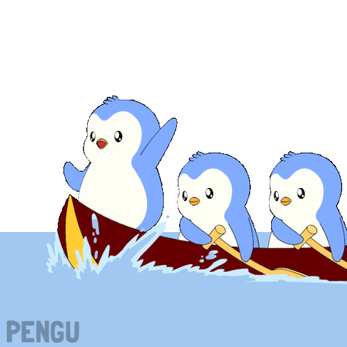 a cartoon of three penguins in a boat with the word pengu underneath them